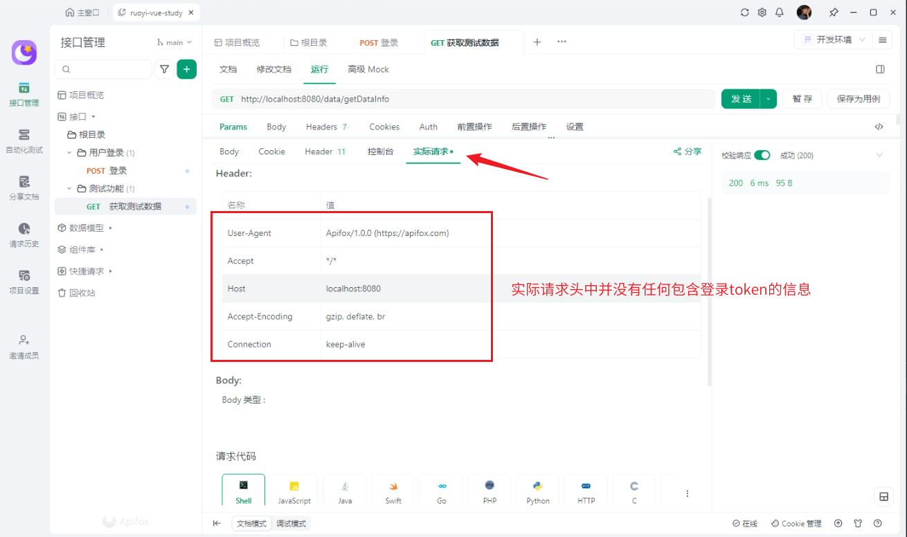 出现上述问题的主要原因是登录时返回的token并没有添加到接口实际的请求上: