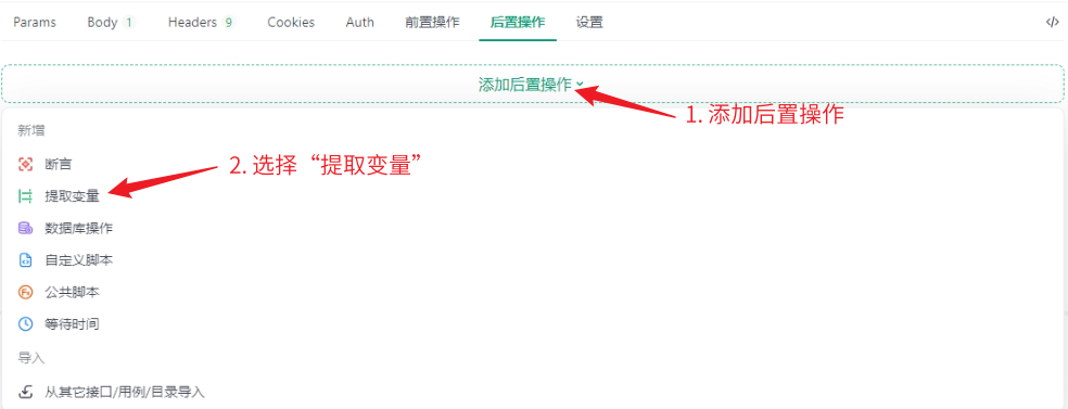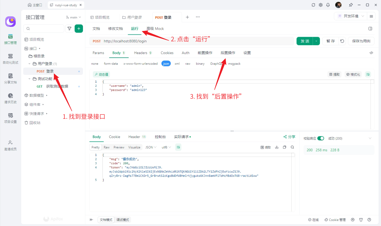 1. 我们先找到用户登录接口,按照下图所示找到接口的后置操作: