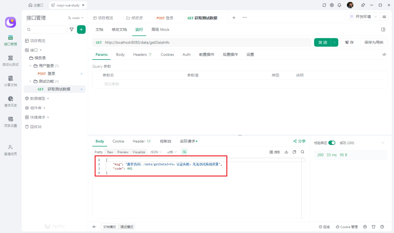我们在Apifox中对该接口进行测试时,响应结果很有可能会出现401的情况:
