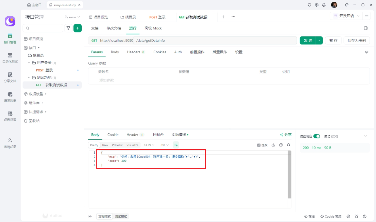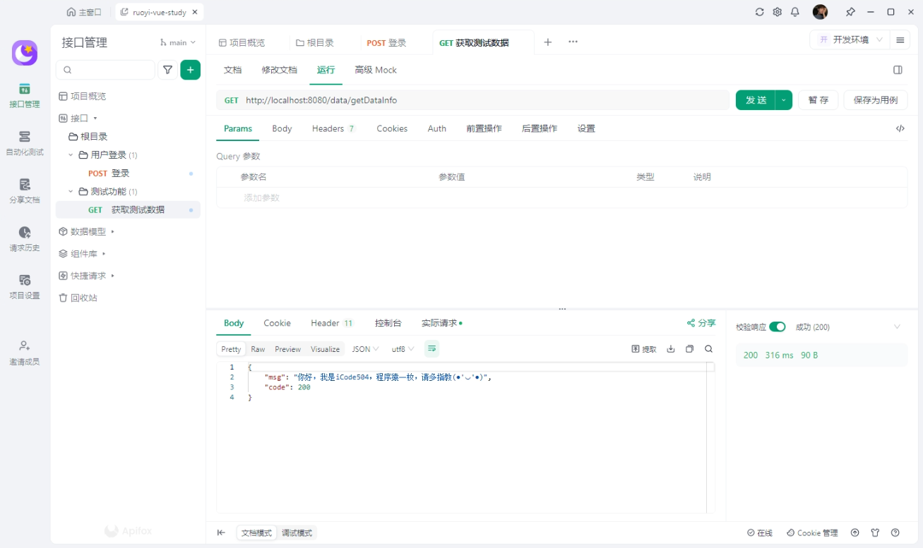 重新启动若依框架,此时到Apifox中对该接口进行测试,也可以看到返回结果: