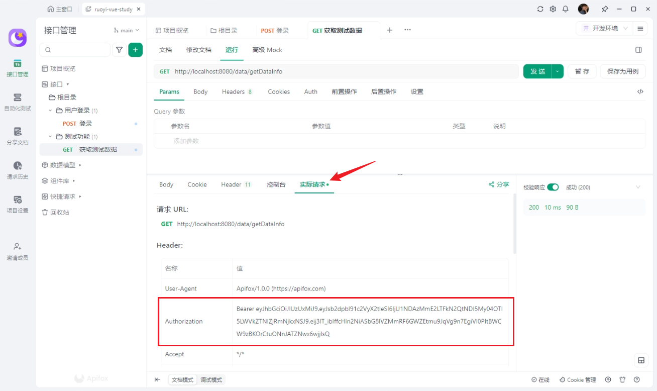 6. 此时接口的实际请求中也包含登录时返回的token信息: