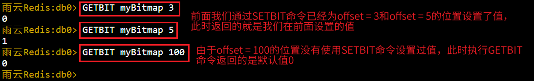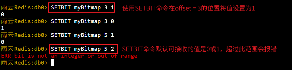 显然,在初次执行上述命令时,Redis中还不存在名为myBitmap的key,此时该位置的值默认是0。在执行SETBIT以后,Redis会将该位置的值设置为1,并返回执行SETBIT之前该位置对应的值(即0).