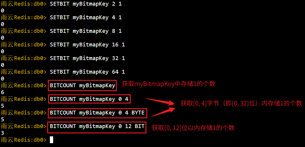 start(可选):统计的起始位置,可以是负数表示从末尾开始计算。end(可选):统计的结束位置,同样可以是负数。BYTE(可选):如果指定,start和end参数以字节为单位(默认)。BIT(可选):如果指定,start和end参数以位为单位。