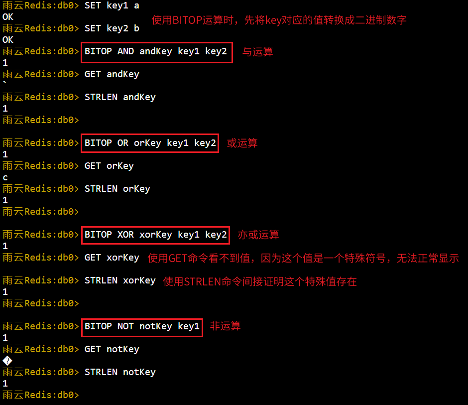 4. 对不同的二进制存储数据进行位运算(AND/OR/NOT/XOR)并存储到destkey中: