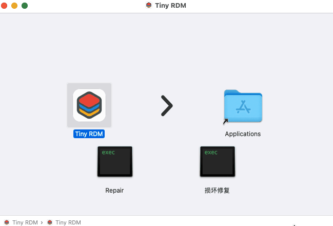 1. 打开dmg文件后,将Tiny RDM拖入到Applications中即可完成安装:
