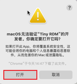 7. 此时会弹出一个提示,直接点击打开即可,此时就可以正常启动Tiny RDM了: