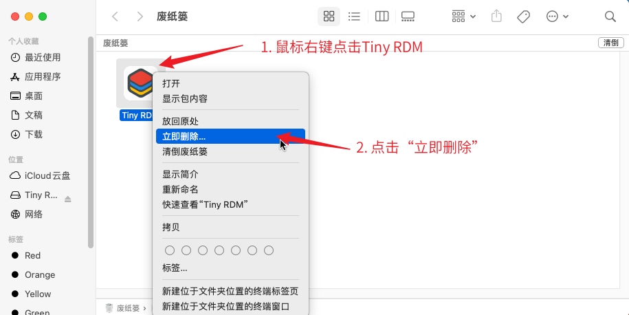 3. 打开废纸篓,鼠标右键点击Tiny RDM图标,选择立即删除,Tiny RDM就成功卸载了: