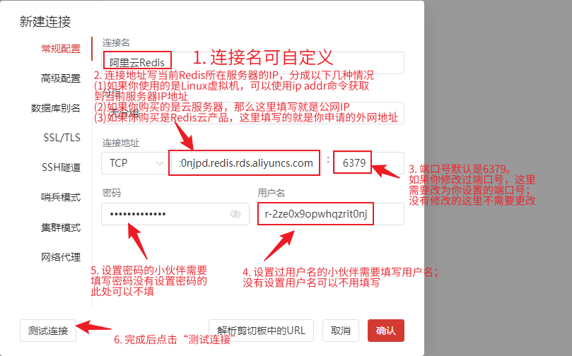 2. 按照下图所示操作,配置Redis的连接配置,完成后点击左下角的测试连接: