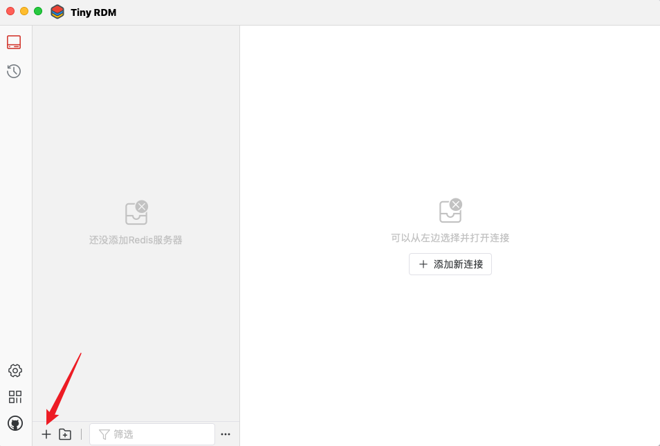 1. 在桌面上打开Tiny RDM,点击左下角的加号,新建一个Redis连接: