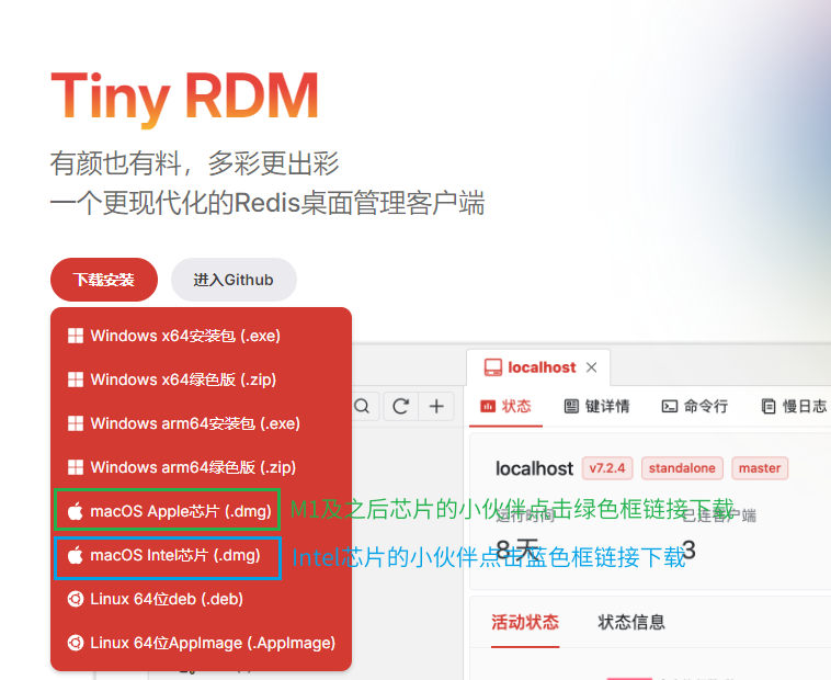 2. 鼠标移到下载安装按钮,使用Intel芯片的小伙伴点击蓝色框链接下载,使用M1及之后的芯片的小伙伴点击绿色框链接下载: