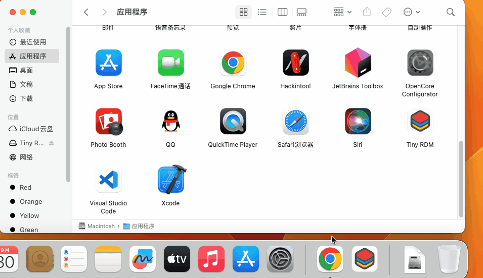 2. 找到Tiny RDM,按照下图所示操作将 IDEA 拖入到废纸篓中: