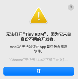 3. 此时会弹出一个错误信息:无法打开“Tiny RDM”,因为它来自身份不明的开发者。(没有这个错误信息并且能正常打开上述软件包的小伙伴请此链接查看后续步骤:点我查看)我们需要解决这个问题: