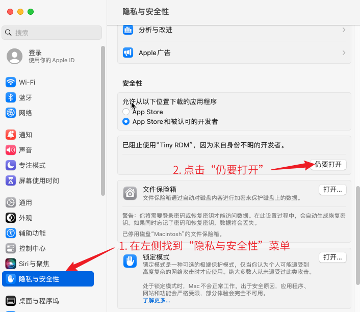 5. 点击左侧隐私与安全性,向下找安全性中有一个提示信息:已阻止使用“Tiny RDM”,因为它来自身份不明的开发者。点击提示信息下方的仍要打开: