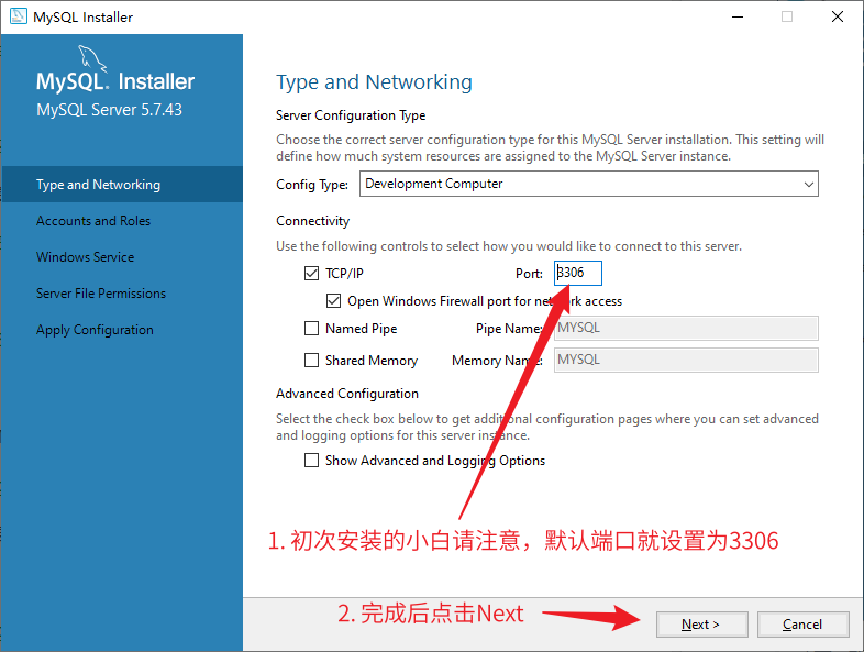9. 初次安装MySQL的小白请注意,下图的Port请务必配置成3306,完成后点击Next: