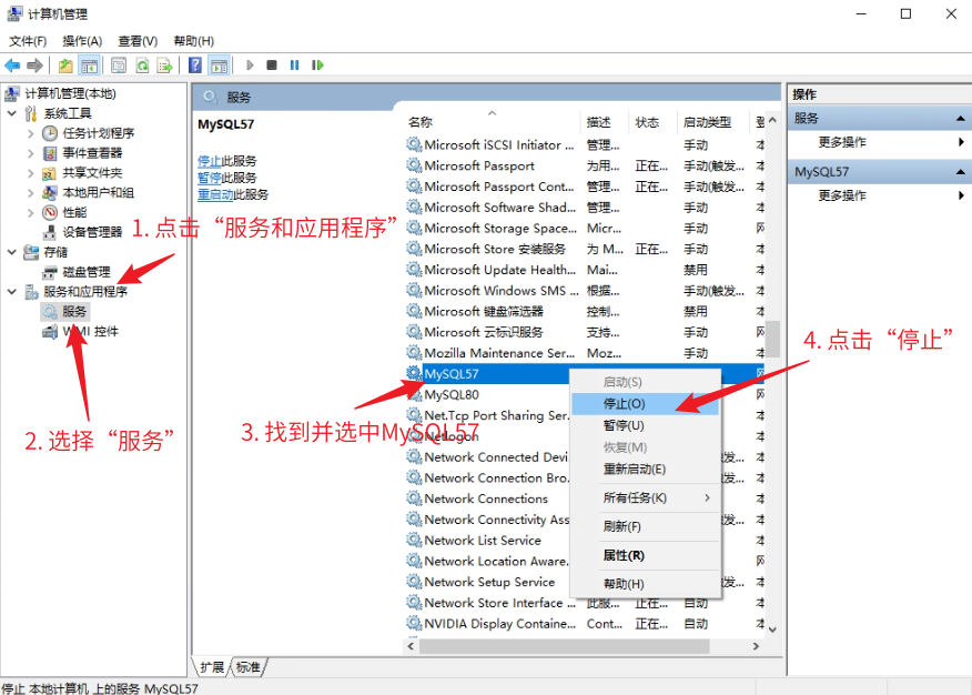 2. 按照下图所示操作,停止MySQL57对应的服务: