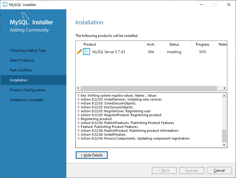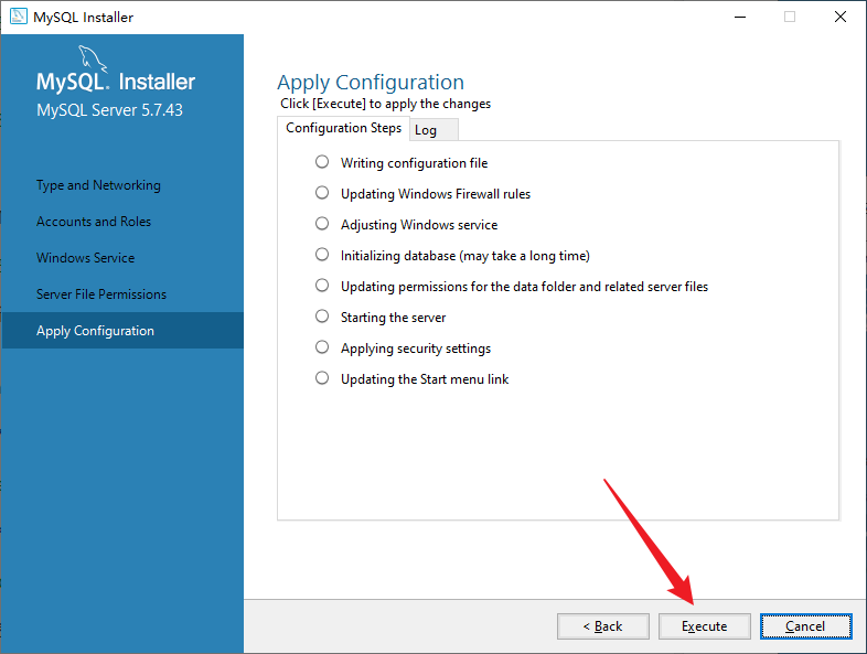13. 点击Execute,MySQL安装器就会为我们配置上述内容。配置过程中,请耐心等待: