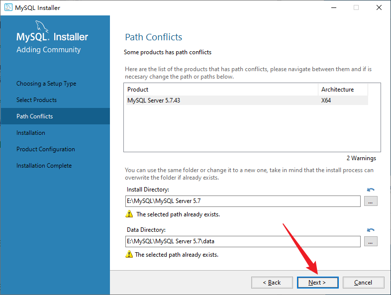 4. 按照下图所示操作,选择安装MySQL Server 5.7.43 - X64,完成后直接点击Next:
