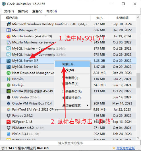 3. 打开Geek Installer,在程序列表中找到MySQL相关的内容,鼠标右键,依次点击卸载: