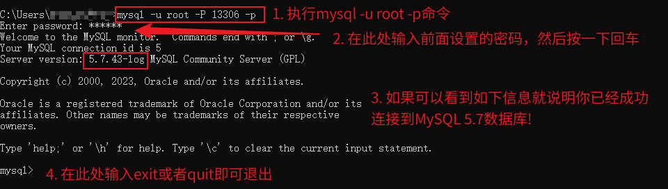 说明:由于我的电脑上安装了两个MySQL,其中MySQL 5.7使用的端口号是13306,因此在执行命令时需要添加