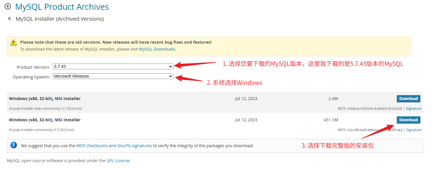 2. 按照下图所示操作选择相应的MySQL版本下载,这里我选择的Windows MySQL 5.7.43版本。