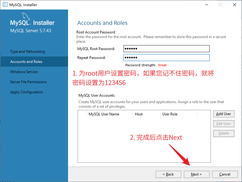10. 设置root账户密码,这里强烈建议将密码设置成你最熟悉的密码,否则后续恢复密码比较麻烦。这里我设置成了123456。设置完成后点击Next: