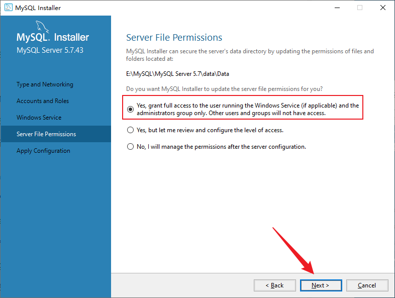 12. 服务器文件权限按照默认配置选择第一个即可,点击Next:
