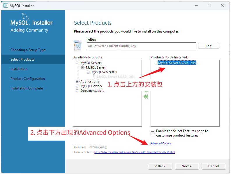 如果您想修改MySQL的安装路径,如下图,可以点击下方Advanced Options: