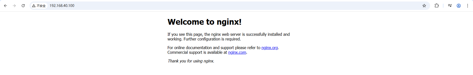 7. 打开本地电脑浏览器,在上方搜索框中输入当前虚拟机的IP地址(这里我的IP地址是192.168.40.100,查询IP地址可以使用ip addr命令),如果可以看到下面的 Nginx 欢迎界面,就说明 Nginx 成功启动: