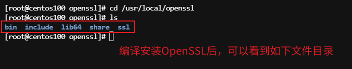 8. 等待一段时间以后,OpenSSL 编译安装完成,切换到/usr/local/openssl目录下,可以看到编译后的文件: