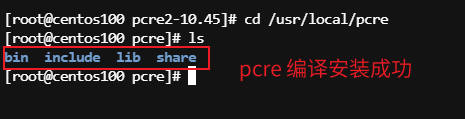 8. 等待一段时间后,Pcre 安装完成,切换到/usr/local/pcre目录下,可以看到编译后的文件: