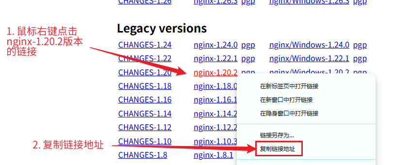 2. 这里我要下载的是 1.20.2 版本的 Nginx。按照下图操作,复制下载链接: