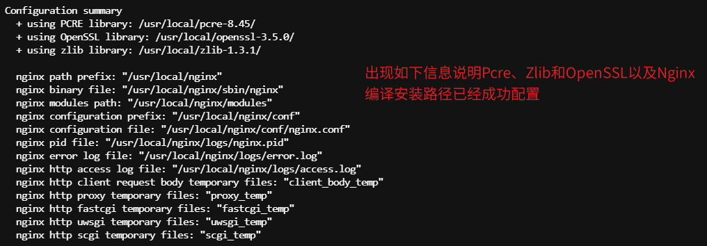 3. 将 OpenSSL 安装在/usr/local/nginx目录下,并添加 Pcre、Zlib 和 OpenSSL 库配置,执行如下命令进行配置: