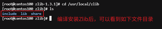 8. 等待约1分钟以后,Zlib 编译安装完成,切换到/usr/local/zlib目录下,可以看到编译后的文件: