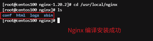 5. 切换到/usr/local/nginx目录,执行ls命令,如果出现下图文件及其目录,就说明 Nginx 安装成功: