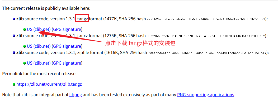 2. 向下找到 Zlib 下载链接,这里我们下载.tar.gz格式的安装包,按照下图所示操作: