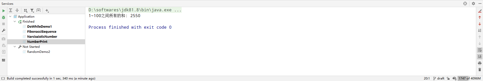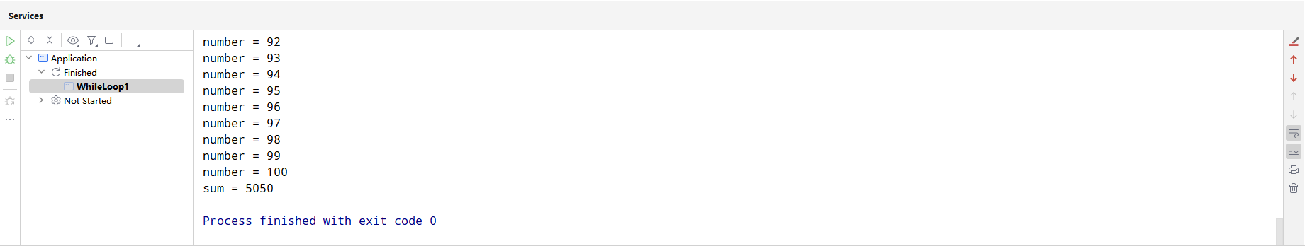 这样就完成了1~100的输出,但是我们还需要输出它们相加的和,我们可以对上述的代码进行进一步改造: