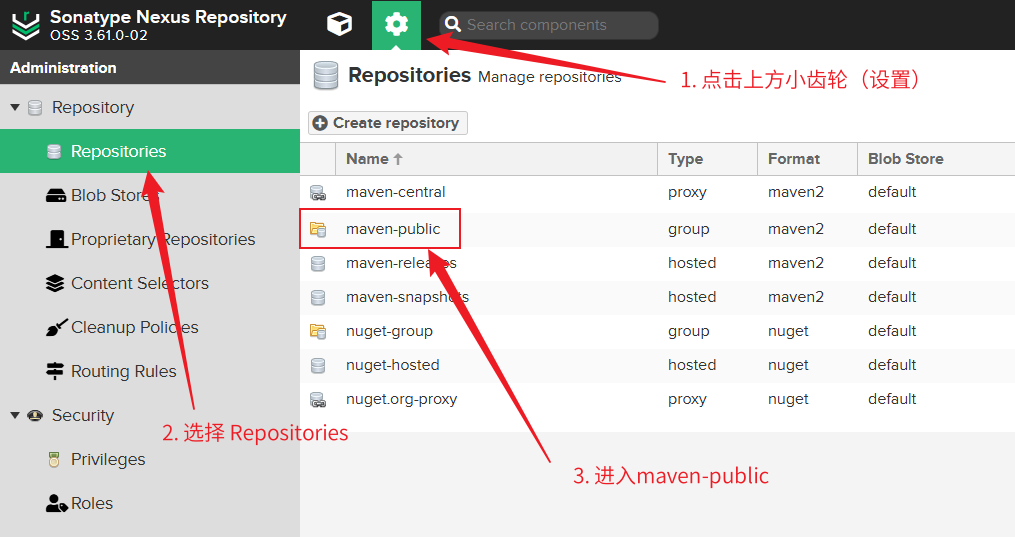| maven-public | 这个仓库存放Nexus获取到的第三方jar包,供开发人员下载。 | group | 存储第三方的jar包 |