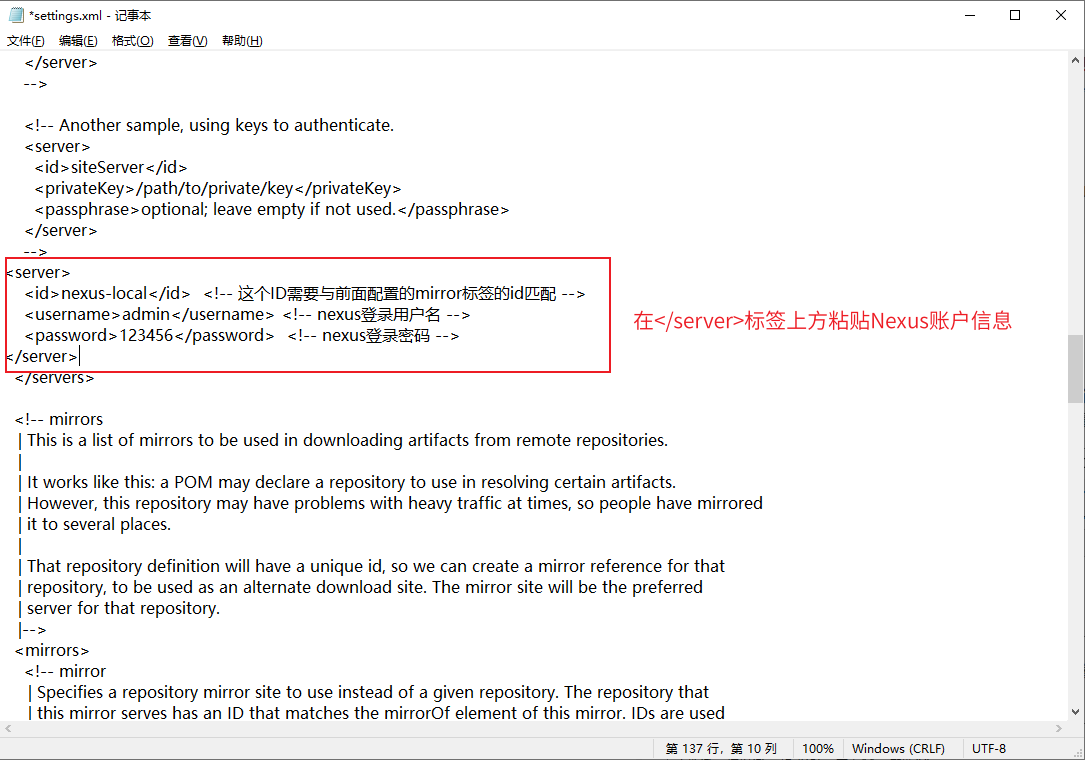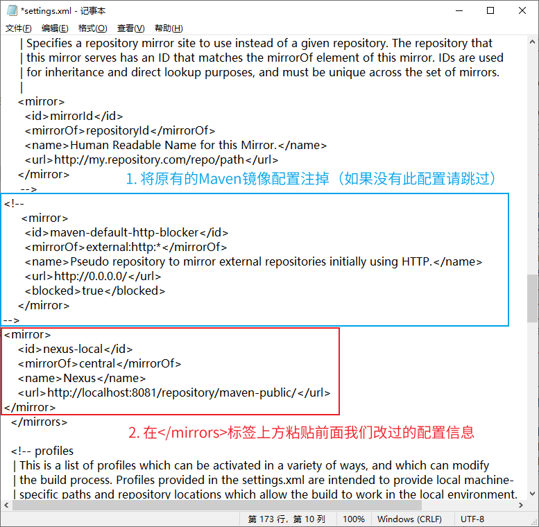 9. 这里我的 Maven 默认配置了一个镜像,我们先将这个镜像注释掉,然后在 </mirrors> 上方粘贴第 7 步的代码,效果图如下: