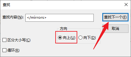 8. 按 CtrlF 键,此时会弹出一个搜索框,在搜索框中搜索 </mirrors>,方向选择向上,然后点击查找下一个,此时记事本会定位到 <mirrors/> 所在位置: