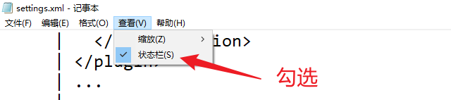 3. 用记事本打开后,在上方菜单栏点击查看,然后点击状态栏,此时记事本右下角会出现行数: