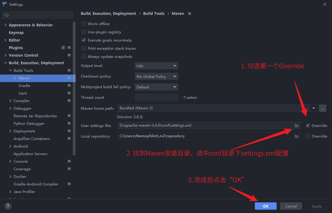 2. 按 CtrlShiftS 键进入设置界面。在左侧找到 Maven 配置,然后按照下面的操作步骤,配置 settings.xml: