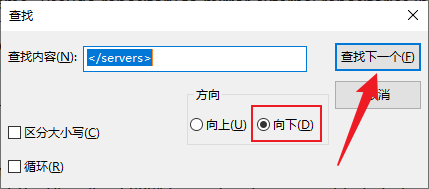 12. 按 CtrlF 键,此时会弹出一个搜索框,在搜索框中搜索 </servers>,方向选择向下,然后点击查找下一个,此时记事本会定位到 <servers/> 所在位置: