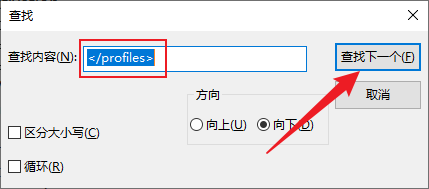 5. 按 CtrlF 键,此时会弹出一个搜索框,在搜索框中搜索 </profiles>,然后点击查找下一个,此时记事本会定位到 <profiles/> 所在位置: