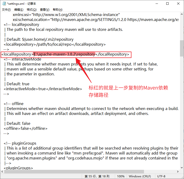 11. 在记事本第 55 行创建一个 <localRepository></localRepository> 标签,并在二者中间粘贴上一步的路径,效果如下图所示: