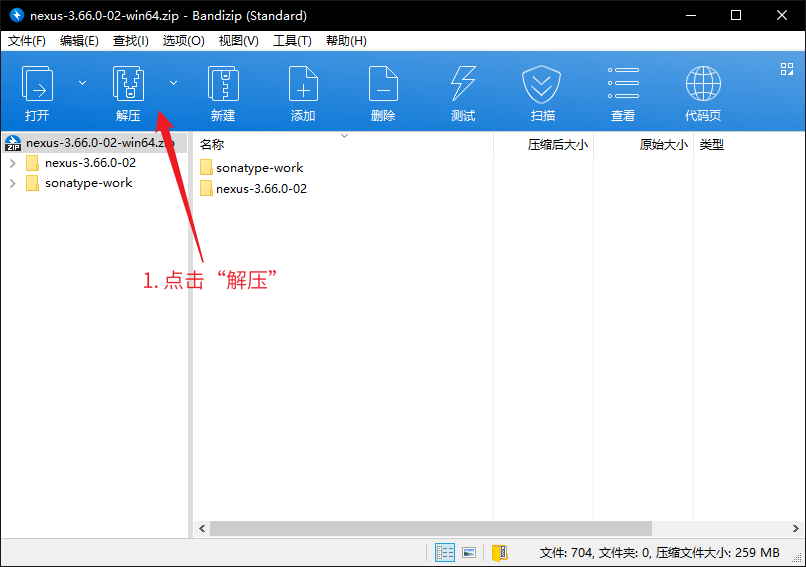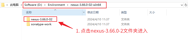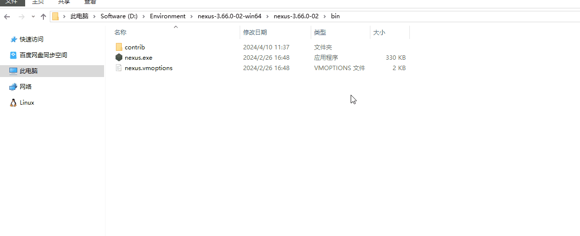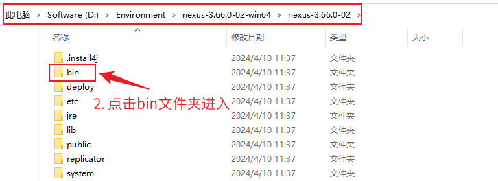 3. 找到解压后的路径,点击第一个文件夹nexus-3.66.0-02进入,然后进入bin文件夹: