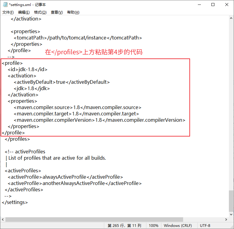 6. 在 <profiles/> 的上一行,粘贴第 4 步的代码,效果图如下: