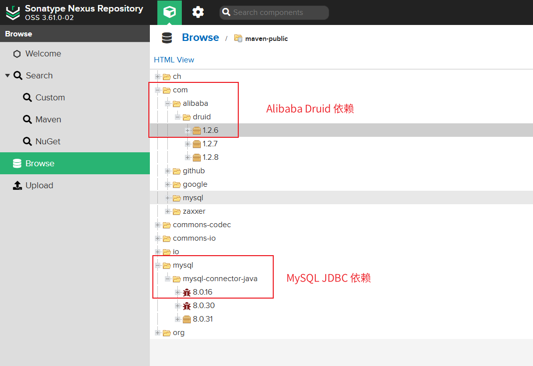 6. 下载完成,打开 Nexus,按照下图所示操作,可以查看到 MySQL JDBC 和 Druid 依赖下载到了 Nexus: