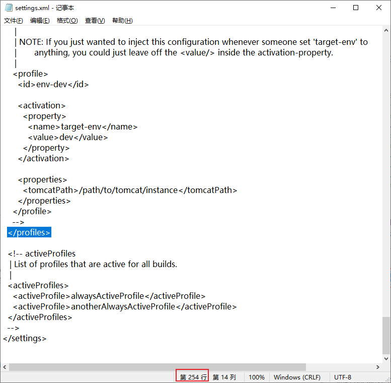 这里我的 <profiles/> 在 254 行(具体行数以你们的为准):