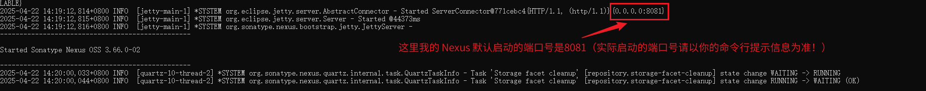1. 在配置 Nexus 之前,我们先看一下成功启动的 Nexus 命令行,这里我默认启动的端口号是8081(具体的端口号,请以你的命令行提示的端口号为准):