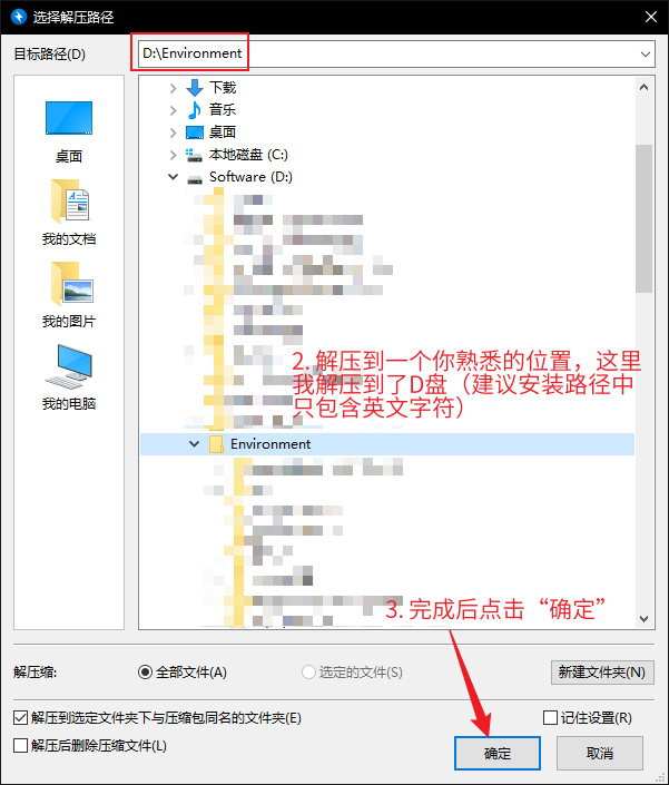 2. 将下载好的安装包解压到一个你熟悉的位置,路径中建议只包含英文字符,这里我解压到了E盘: